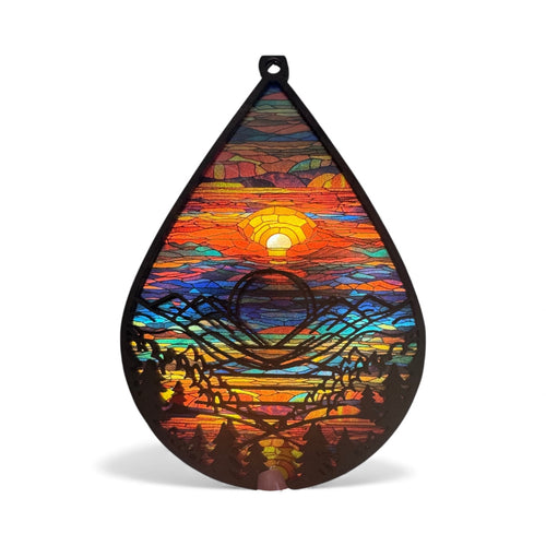 Mountain Sunset Stained Glass Sun Catcher – Teardrop Window Hanging | Rainbow Light Catcher | Laser Cut Boho Decor